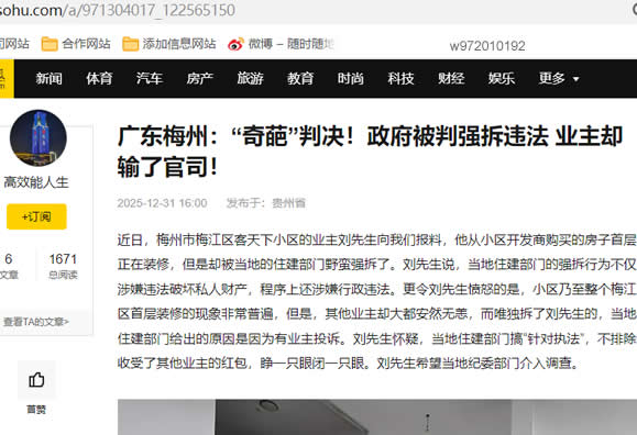 梅州中院庭审中虽未组织质证,却又在二审判决书中事实上径行采纳了该证据,并据此认定“室内装修属于违建”,着实令人诧异!“这明显构成程序违法,梅州中院竟然违背法律规定做出违法判决,脸都不要了,无耻至极啊!”刘先生愤怒道。