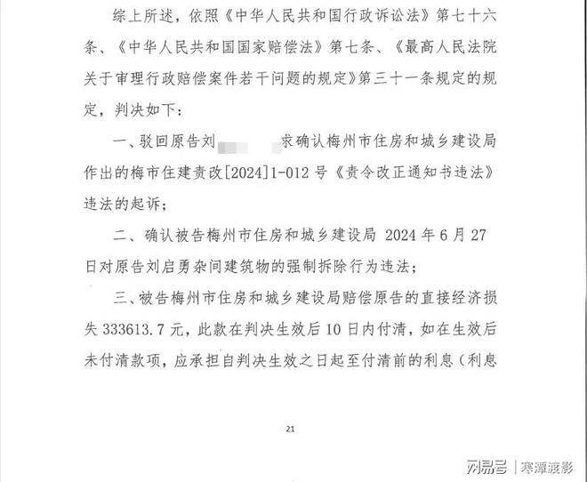 事后,刘先生起诉了梅州市住建局,一审法院判定梅州市住建局的强拆行为违法,赔偿刘先生直接经济损失33万多元。