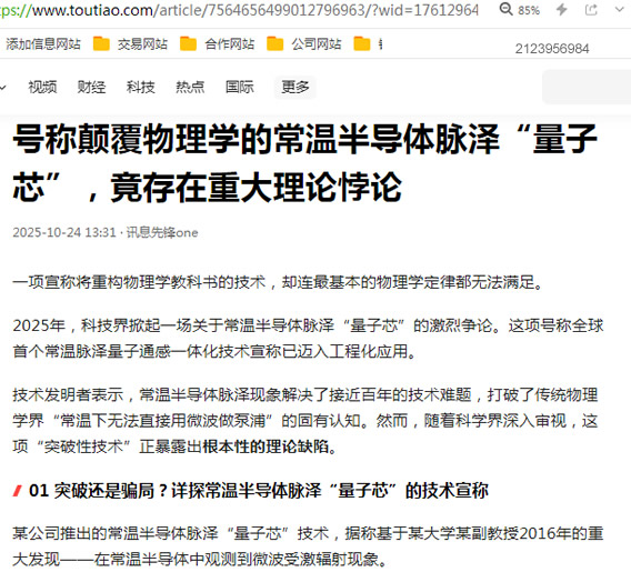 科学史上真正的突破,如激光器的发明、高温超导的发现,都在权威学术期刊上有详实的实验数据和理论分析,并经过严格的同行评议。而常温半导体脉泽“量子芯”技术恰恰缺少这一关键环节。