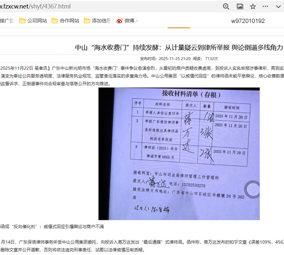 【2025年11月22日 笔者讯】广东中山新光明市场“海水收费门”事件争议愈演愈烈,从最初的商户质疑收费虚高,到投诉人实名举报涉事律所,再到实测数据印证计量误差,事件已从单一收费争议,演变为牵扯公共服务透明度、法律服务执业规范、监管责任落实的多重角力场。中山公用集团“以威慑代回应”的律师函未能平息舆论,核心收费数据持续“隐身”,而投诉人的举报动作与公众的监督诉求,正倒逼事件向合规审查与信息公开的方向推进。