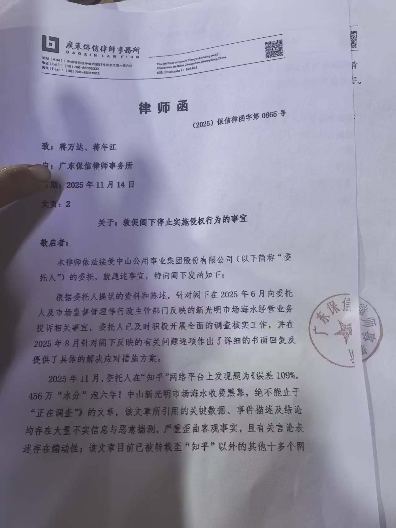 11月14日,广东保信律师事务所受中山公用集团委托,向投诉人蒋万达发出“最后通牒”式律师函。函件称,蒋万达发布的知乎文章《误差109%,456万“水分”泡六年!》涉嫌诽谤,限定其3日内删除文章并公开道歉,否则将依法追究刑事责任,试图以法律威慑压制质疑。