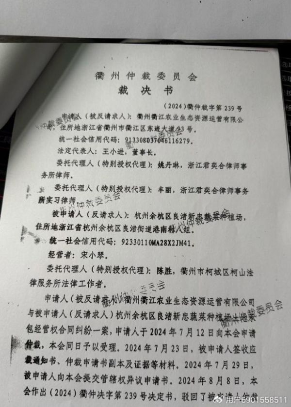 因为这些问题谈不拢,衢州衢江农业生态资源运营有限公司在 2025 年 9 月 16 日申请了仲裁。有意思的是,4 天前(9 月 12 日)刚公布了新修订的《仲裁法》,里面说农村土地承包的纠纷不能走仲裁,但这部法律要到 2026 年 3 月才生效。最终仲裁机构在新法生效前审结案件,作出了未支持种植场的裁决。