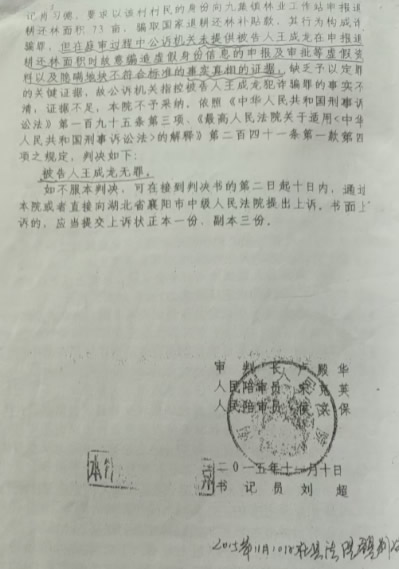 (六同的情况下,(2015)鄂南漳刑初字第00042号判决中,认定王成龙无罪。) 案件回溯:十年申诉路,定罪免刑仍留“污点”