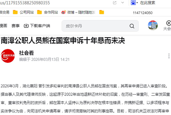 同年11月,南漳县法院重审后作出判决(2015)鄂南漳刑初字第00114号),再次认定熊在国犯贪污罪,但免予刑事处罚。尽管免于实际服刑,但这一刑事定罪记录对其公职人员身份、个人名誉及家庭造成了持续影响。为此,熊在国启动了长达十年的申诉之路,并于近期提交了再审申请。
